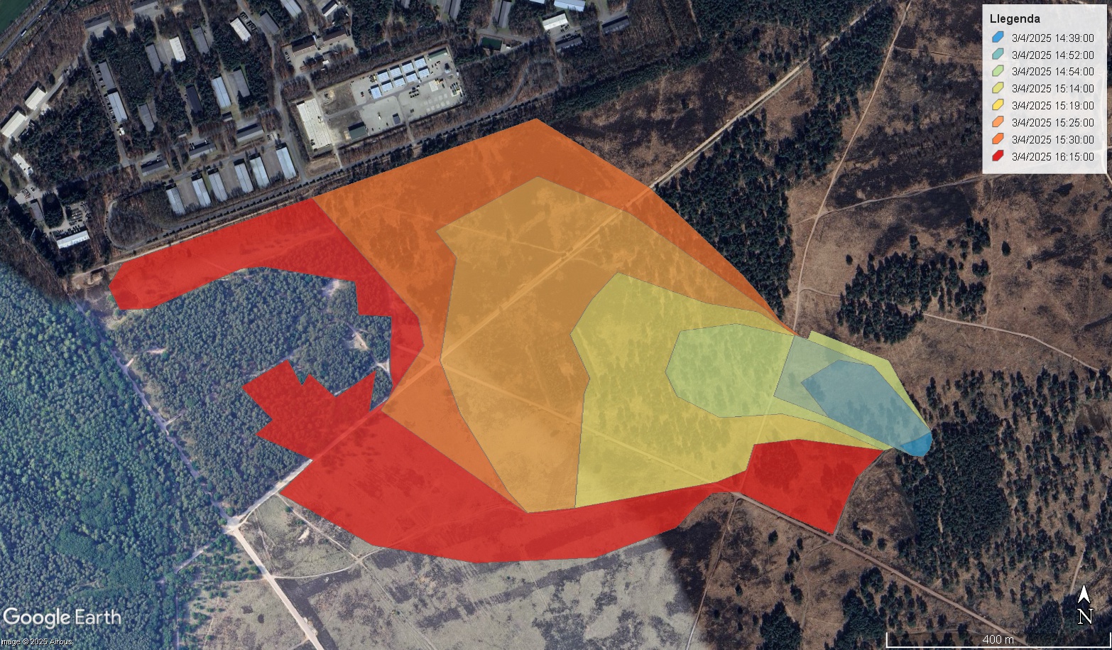 The Ede wildfire started due to military practice in the heatland with a smoke grenade. After showing only some backing fire behaviour for some time, the fire spotted accross the road and was able to make runs with the wind. The fire spotted on large distances for Dutch standards, allowing it to make two runs of 6 km/h. Attempts to stop the head of the fire proved unsuccesful and resulted in a fire truck burned, among others. The fire’s head stopped due to a discontinuity in fuel within the military base that it impacted. There was only one spotfire within the military base.